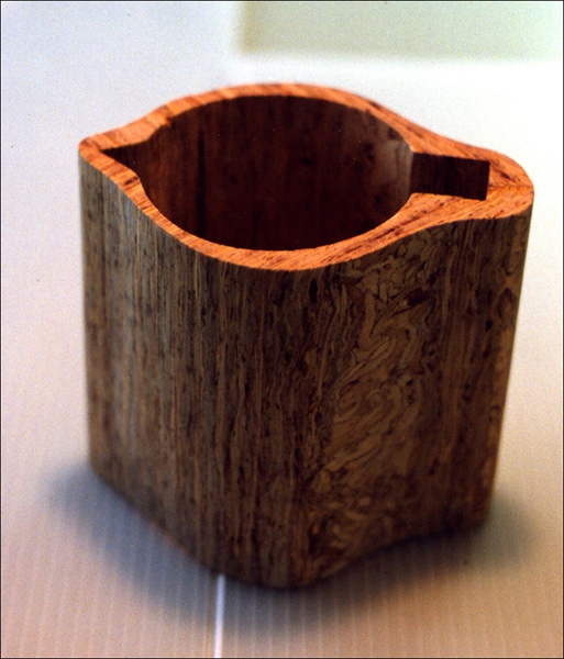 Cozy sized for small Bodum coffee maker, carved out of a laminated block of oriented strand board