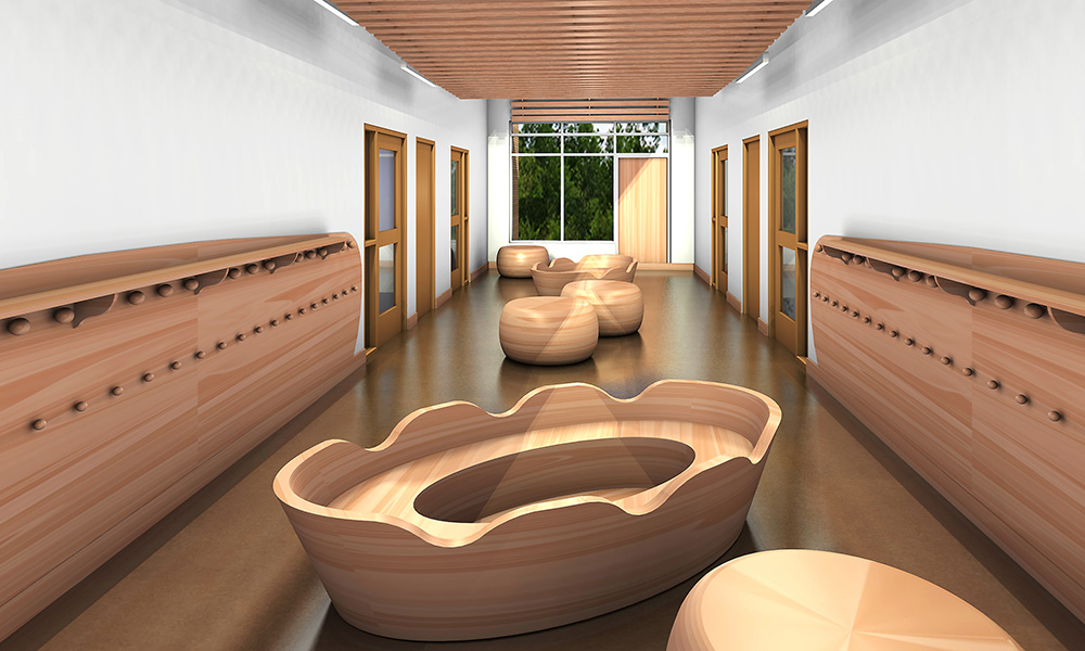 3D modelling as well as design of furniture & exterior cladding. The cladding is based on traditional Mi’kmaq basket patterns – solid red was selected, with a basket pattern in the siding. Wagmatcook First Nation, Cape Breton